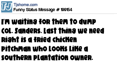 X says I'm waiting for them to dump Col. Sanders. Last thing we need right is a fried chicken pitchman who looks like a southern plantation owner.