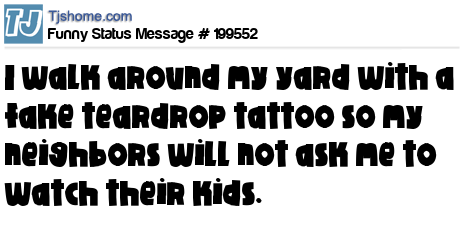 X says I walk around my yard with a fake teardrop tattoo so my neighbors will not ask me to watch their kids.