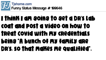 X says I think I am going to get a Dr's lab coat and post a video on how to treat Covid with my credentials being "A bunch of my family are Dr's, so that makes me qualified".