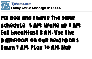 X says My dog and I have the same schedule: 6 AM: Wake up 7 AM: Eat breakfast 8 AM: Use the bathroom on our neighbor’s lawn 9 AM: Play 10 AM: Nap