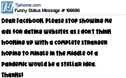 - # 198408 Thanks Facebook for showing me dating websites, but I don't think dating strangers looking to hook up would be a stella way to socially distance myself right now, but maybe after the Coronavirus!
