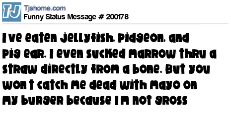 X says I’ve eaten jellyfish, pidgeon, and pig ear. I even sucked marrow thru a straw directly from a bone. But you won’t catch me dead with mayo on my burger because I’m not gross