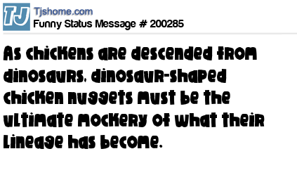 X says As chickens are descended from dinosaurs, dinosaur-shaped chicken nuggets must be the ultimate mockery of what their lineage has become.