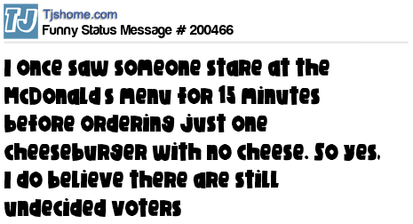 X says I once saw someone stare at the McDonald’s menu for 15 minutes before ordering just one cheeseburger with no cheese. So yes, I do believe there are still undecided voters