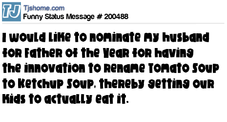 X says I would like to nominate my husband for Father of the Year for having the innovation to rename Tomato Soup to Ketchup Soup, thereby getting our kids to actually eat it.