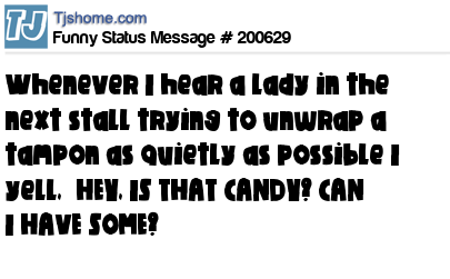 X says Whenever I hear a lady in the next stall trying to unwrap a tampon as quietly as possible I yell, “HEY, IS THAT CANDY? CAN I HAVE SOME?”
