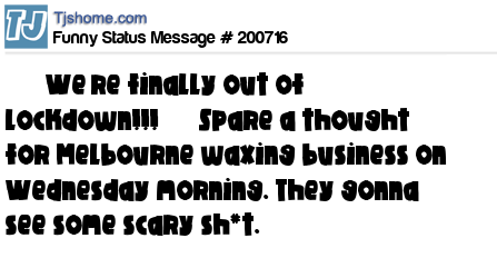 X says We’re finally out of lockdown!!! Spare a thought for Melbourne waxing business on Wednesday morning. They gonna see some scary sh*t.