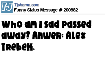 - # 104375 glad Alex Trebek's life isn't in *puts sunglasses on* jeopardy.. actually I really don't care.