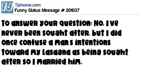 X says To answer your question: No, I’ve never been sought after, but I did once confuse a man’s intentions toward my lasagna as being sought after so I married him.