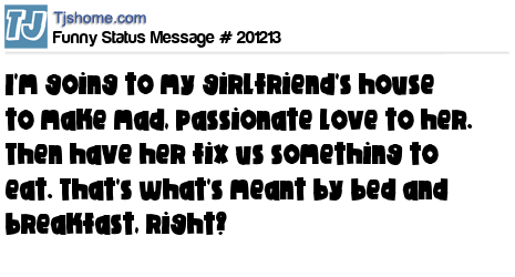 X says I'm going to my girlfriend's house to make mad, passionate love to her. Then have her fix us something to eat. That's what's meant by bed and breakfast, right?