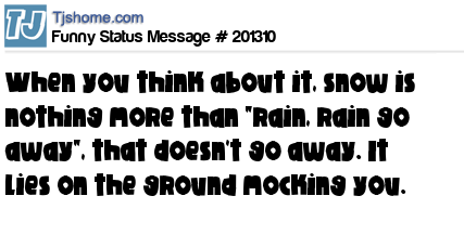 X says When you think about it, snow is nothing more than "rain, rain go away", that doesn't go away. It lies on the ground mocking you.