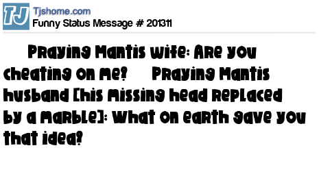 X says Praying Mantis wife: Are you cheating on me? Praying Mantis husband [his missing head replaced by a marble]: What on earth gave you that idea?