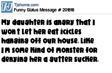 X says My daughter is angry that I won’t let her eat icicles hanging off our house, like I’m some kind of monster for denying her a gutter sucker.