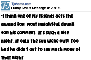 X says -I think one of my friends gets the award for “most insightful drunk” for his comment, “It’s such a nice night…if only the sun were out!” Too bad he didn’t get to see much more of that night.