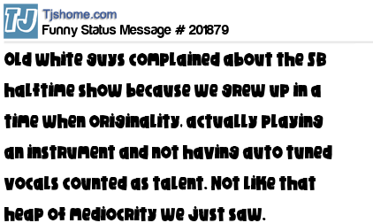 X says Old white guys complained about the SB halftime show because we grew up in a time when originality, actually playing an instrument and not having auto tuned vocals counted as talent. Not like that heap of mediocrity we just saw.