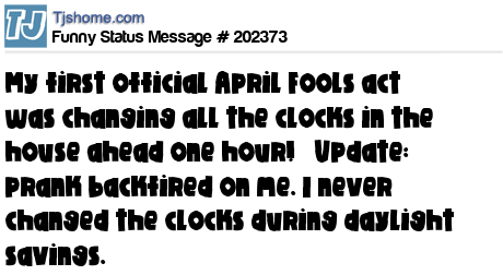 X says My first official April Fools act was changing all the clocks in the house ahead one hour! Update: prank backfired on me. I never changed the clocks during daylight savings. 🙄