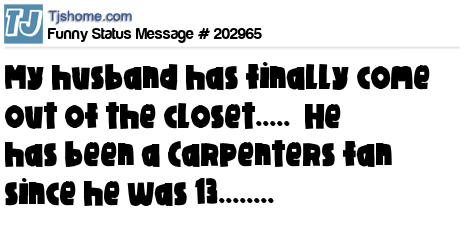 X says My husband has finally come out of the closet..... He has been a Carpenters fan since he was 13........