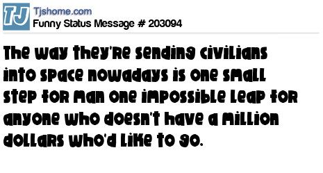 X is The way they're sending civilians into space nowadays is one small step for man one impossible leap for anyone who doesn't have a million dollars who'd like to go.