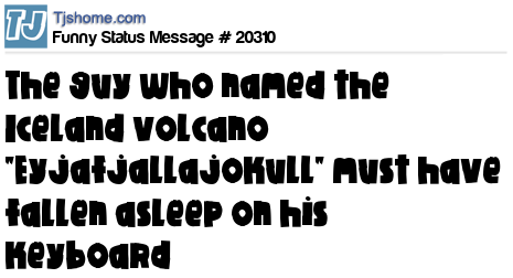 - # 19477 -- The Icelandic volcano that has fu***d the majority of Europe's air travel is situated in Eyjafjallajokull, which translates into English as 'fell asleep on my keyboard'.....