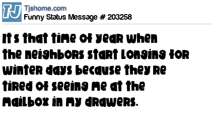 X says It’s that time of year when the neighbors start longing for winter days because they’re tired of seeing me at the mailbox in my drawers.