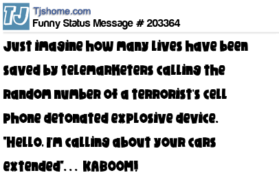 X says Just imagine how many lives have been saved by telemarketers calling the random number of a terrorist's cell phone detonated explosive device. "Hello, I'm calling about your cars extended". . . KABOOM!
