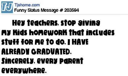 X says       Hey teachers, stop giving my kids homework that includes stuff for me to do. I HAVE ALREADY GRADUATED.      Sincerely, every parent everywhere.