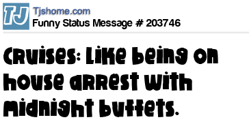 - # 197343 Virus or no virus, cruises hold no appeal for me. It's akin to a 5 star house arrest that's centered around overeating, which I can do quite well in the comfort of my own home.
