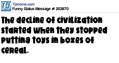 X says The decline of civilization started when they stopped putting toys in boxes of cereal.