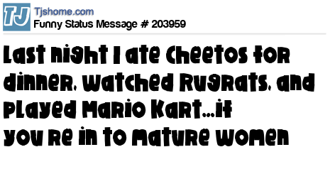 X says Last night I ate Cheetos for dinner, watched Rugrats, and played Mario Kart…if you’re in to mature women