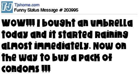 X is WOW!!! I bought an umbrella today and it started raining almost immediately. Now on the way to buy a pack of condoms !!!