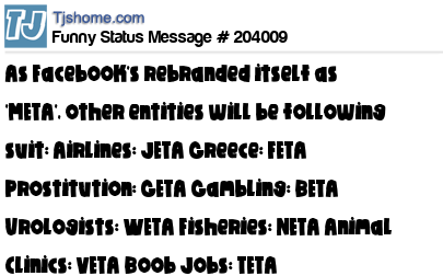 X says As Facebook's rebranded itself as 'META', other entities will be following suit: Airlines: JETA Greece: FETA Prostitution: GETA Gambling: BETA Urologists: WETA Fisheries: NETA Animal Clinics: VETA Boob Jobs: TETA