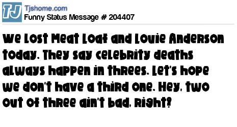 X says We lost Meat Loaf and Louie Anderson today. They say celebrity deaths always happen in threes. Let's hope we don't have a third one. Hey, two out of three ain't bad, right?