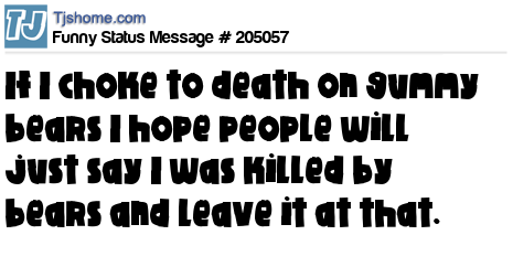 - # 193041 If I ever choke to death eating these gummy bears will one of you please do me a favor and just post on my wall "He was killed by bears!" and just leave it at that.