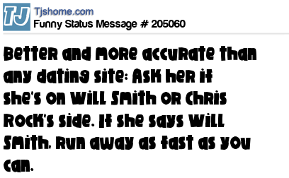 X says Better and more accurate than any dating site: Ask her if she's on Will Smith or Chris Rock's side. If she says Will Smith, run away as fast as you can.