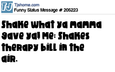X says Shake what ya mamma gave ya! Me: Shakes therapy bill in the air.