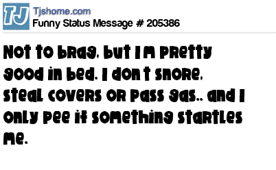 - # 208112 Not to brag or anything, but I’m pretty good in bed. I don’t snore, steal covers or pass gas.. and I only pee if something startles me.