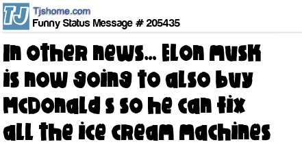 - # 205533 In other news… Elon Musk is now going to also buy McDonald's so he can fix all the ice cream machines.