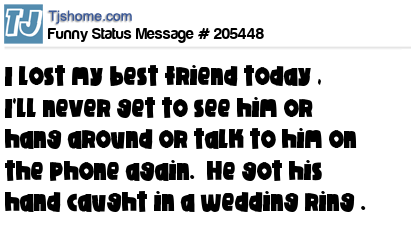 X says I lost my best friend today , I'll never get to see him or hang around or talk to him on the phone again. He got his hand caught in a wedding ring .