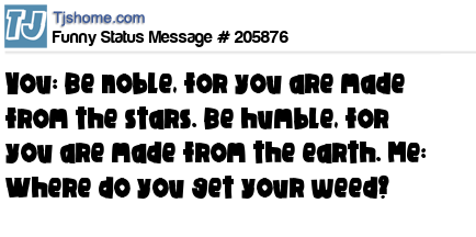 X says You: Be noble, for you are made from the stars. Be humble, for you are made from the earth. Me: Where do you get your weed?