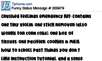 X says Crushed feelings emergency kit: Contains one tiny violin, one stick remover (also works for corn cobs), one box of tissues, one pacifier, cookies & milk, how to scroll past things you don’t like instruction tutorial, and a sense of humor.