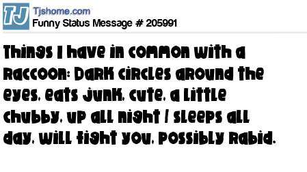 X says Things I have in common with a raccoon: Dark circles around the eyes, eats junk, cute, a little chubby, up all night / sleeps all day, will fight you, possibly rabid.