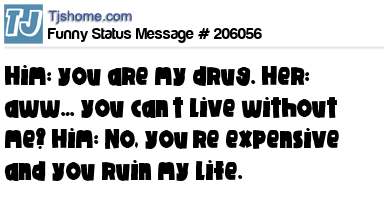 X says Him: you are my drug. Her: aww… you can’t live without me? Him: No, you’re expensive and you ruin my life.