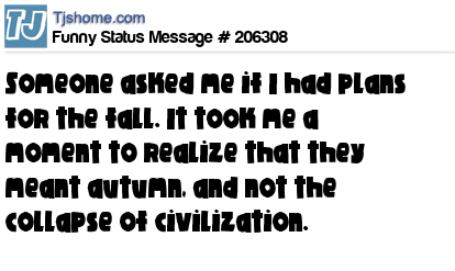 - # 209078 Someone asked me if I had plans for the fall. It took me a moment to realize they meant "autumn", not the collapse of civilization.