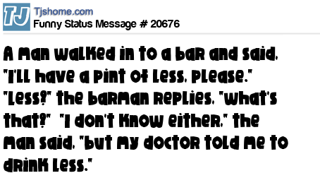 X A man walked in to a bar and said, "I'll have a pint of less, please." "Less?" the barman replies, "what's that?" "I don't know either," the man said, "but my doctor told me to drink less."