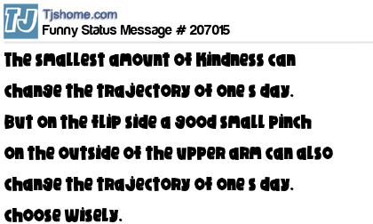 X says The smallest amount of kindness can change the trajectory of one’s day. But on the flip side a good small pinch on the outside of the upper arm can also change the trajectory of one’s day. choose wisely.
