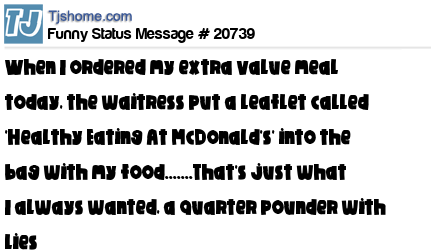 X says When I ordered my extra value meal today, the waitress put a leaflet called 'Healthy Eating At McDonald's' into the bag with my food.......That's just what I always wanted, a quarter pounder with lies