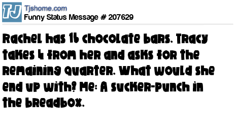 X says Rachel has 16 chocolate bars. Tracy takes 4 from her and asks for the remaining quarter. What would she end up with? Me: A sucker-punch in the breadbox.