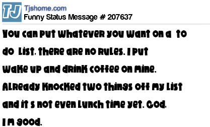 X says You can put whatever you want on a “to do” list, there are no rules. I put wake up and drink coffee on mine. Already knocked two things off my list and it’s not even lunch time yet. God, I’m good.