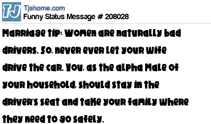 X is Marriage tip: Women are naturally bad drivers. So, never ever let your wife drive the car. You, as the alpha Male of your household, should stay in the driver's seat and take your family where they need to go safely.