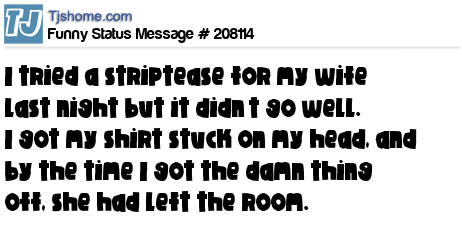 - # 205387 tried a striptease for my wife last night but it didn’t go well. I got my shirt stuck on my head, and by the time I got it off, she had left the room.
